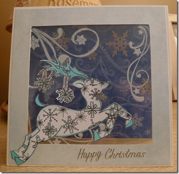 I loved this snowflake reindeer as soon as I saw it. I love reindeer images for Christmas cards and this one is really graceful. It was designed by Gayle Bond for Scrapbook Sisters. I outlined it with pale blue Copics and coloured in the hooves and antlers. I cut an aperture in a square card and stamped acetate with white Stazon which I pit in the aperture. I used a blue snowflake paper inside the card.